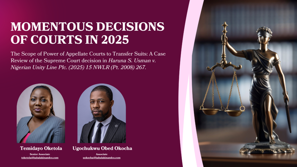 Momentous Decisions of Courts in 2025 The Scope of Power of Appellate Courts to Transfer Suits: A Case Review of the Supreme Court decision in Haruna S. Usman v. Nigerian Unity Line Plc. (2025) 15 NWLR (Pt. 2008) 267.TweetSharePinShare0 Shares